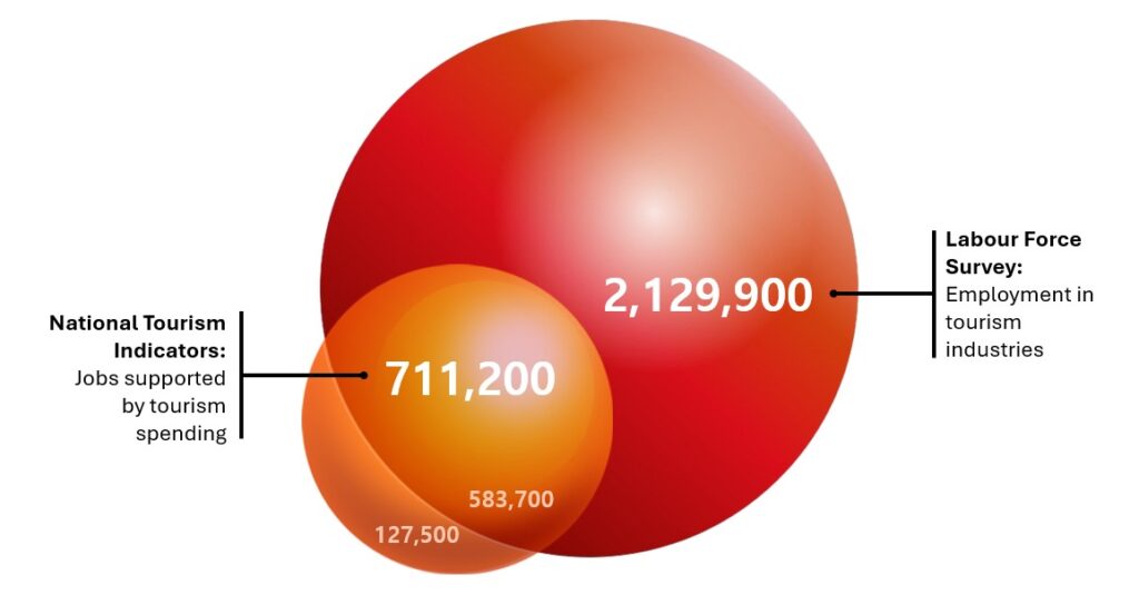 Well, it depends what you actually want to know. Are you seeking the number of people who hold jobs in tourism businesses? Or are you more interested in how many of those jobs exist because of tourists? Both are important data points, and both show up in public messaging and advocacy work in support of our sector, so it’s really important to make sure that the right number is used in the right context.