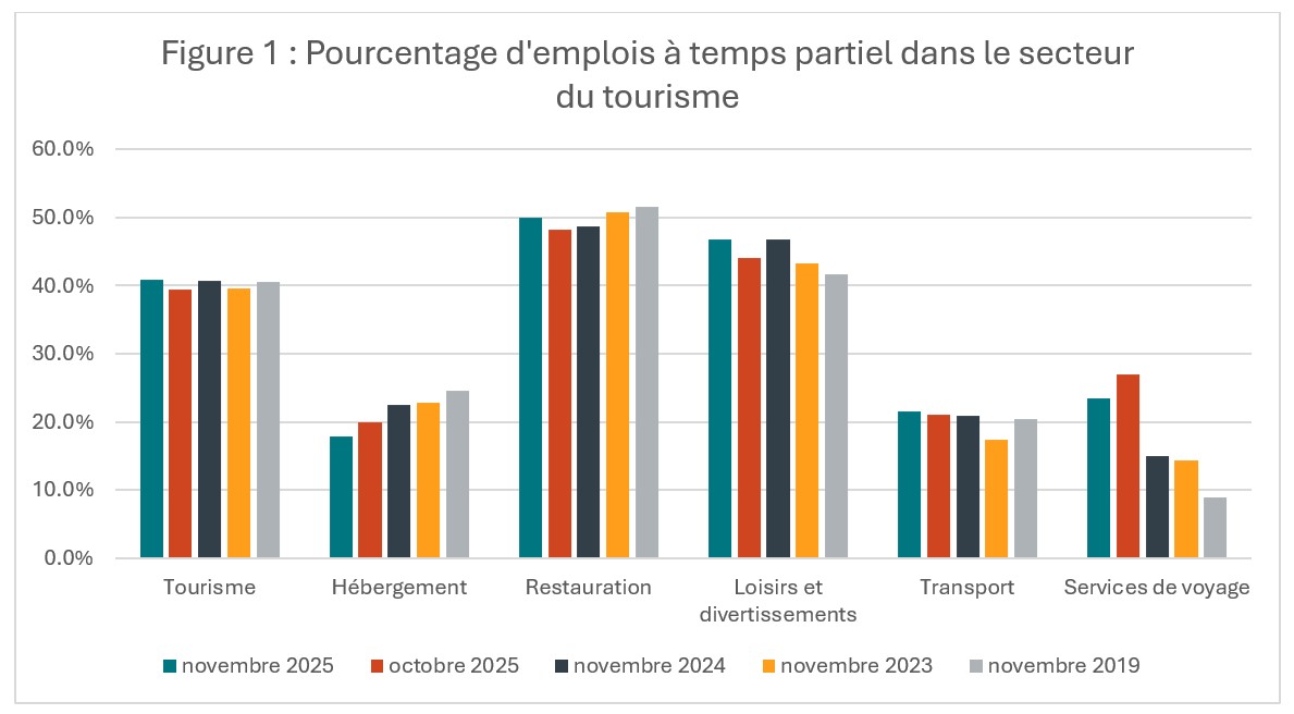 Le travail à temps partiel[3] a augmenté en proportion de l’ensemble de l’emploi touristique en novembre, mais seulement d’environ 1,5 point de pourcentage, demeurant généralement stable autour de la barre des 40 % dans l’ensemble du secteur. Cette légère augmentation est plus ou moins conforme aux observations faites dans l’ensemble de l’économie, où les gains d’emploi ont principalement concerné le travail à temps partiel. À moins que cette légère hausse ne marque le début d’une tendance plus large, il ne s’agit pas nécessairement d’un signal d’alarme, car le secteur du tourisme a toujours été caractérisé par des taux élevés et fluctuants d’emploi à temps partiel. Cet indice offre une perspective intéressante sur la stabilité du secteur, car les entreprises peuvent plus facilement répondre aux variations de la demande des consommateurs en modulant les heures travaillées parmi leur personnel existant qu’en embauchant de nouveaux employés ou en licenciant du personnel.