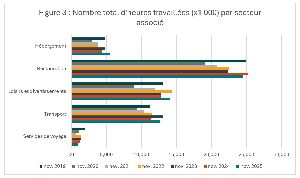 Une autre mesure utile pour évaluer la stabilité de l’emploi touristique est l’estimation du nombre total d’heures travaillées, qui nous permet de trianguler le nombre d’emplois et la part du travail à temps partiel. Comme le montre la figure 2, le nombre d’heures travaillées dans le secteur du tourisme a légèrement augmenté par rapport à octobre (+1,3 %), et de façon plus substantielle par rapport à l’année dernière (+5,0 %). Le nombre total d’heures travaillées a dépassé les niveaux de 2019 pour la première fois en septembre, et est resté valorisé (+3,2 %) en novembre.