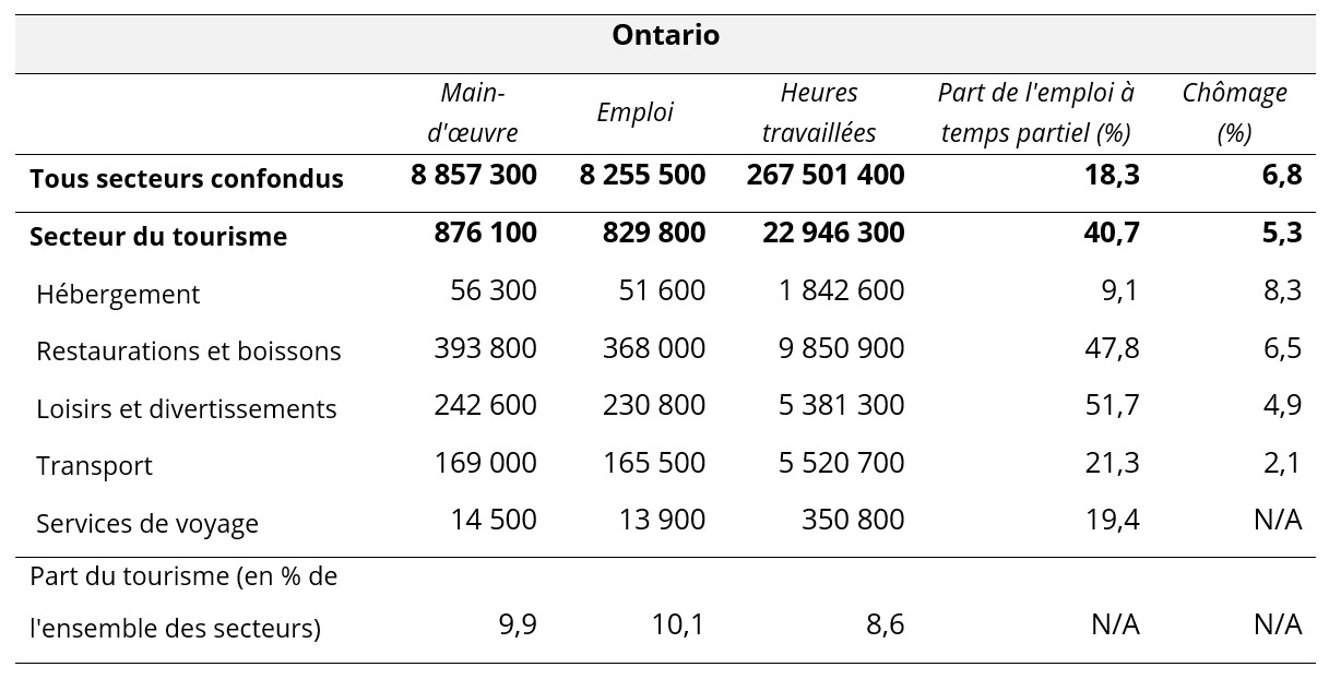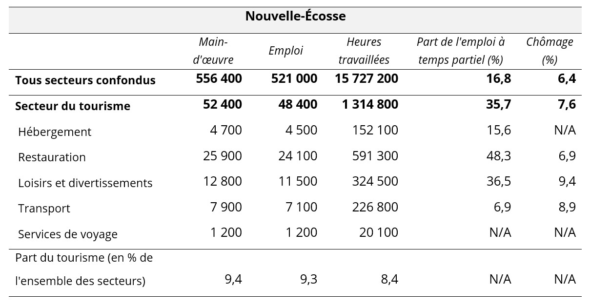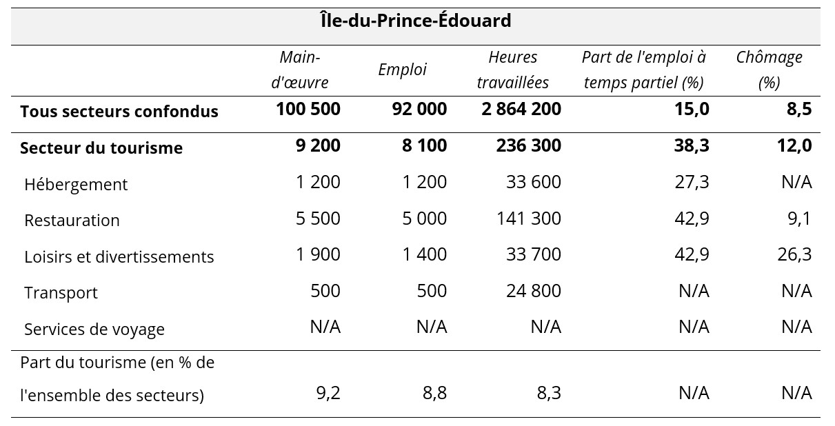 Les dix tableaux suivants présentent les sommaires des provinces pour septembre 2025, en mettant l’accent sur le tourisme et ses cinq secteurs associés. Des données comparatives sont fournies pour l’ensemble de l’économie provinciale à titre de critère de référence. Des données non désaisonnalisées sont fournies pour la main-d’œuvre, l’emploi et les heures travaillées, et la dernière ligne de chaque tableau indique la part du tourisme dans chacune de ces mesures. La part du travail à temps partiel (par opposition au travail à temps plein) est également fournie, en tant qu’indicateur approximatif de la composition de la main-d’œuvre, ainsi que les taux de chômage.