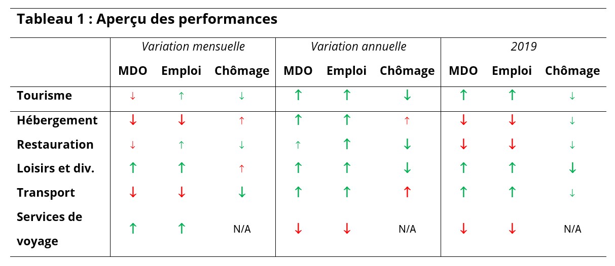 Au niveau des secteurs associés (voir la figure 3), les heures travaillées dans l’hébergement ont augmenté de manière significative par rapport à l’année dernière et ont même dépassé les niveaux de 2019. Dans la restauration, le nombre d’heures travaillées a baissé par rapport à l’année dernière, bien que la tendance générale soit à la reprise depuis la pandémie, comme c’est le cas depuis cinq ans. Les loisirs et divertissements et les transports ont tous deux enregistré des gains d’une année sur l’autre, et les services de voyage ont connu une baisse modérée, mais il se peut que cela ne soit pas entièrement représentatif du secteur associé.