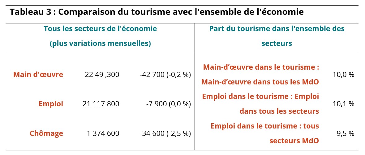 En novembre, l’emploi dans le secteur du tourisme s’est maintenu autour de 2,1 millions de personnes (+2 000, +0,1 %), dans le cadre de la main-d’œuvre touristique à 2,2 millions de personnes (-3 300, -0,2 %). Le chômage a diminué d’environ 5 300 personnes, ramenant le taux de chômage à 4,9 % (-0,2 point de pourcentage par rapport à octobre). L’emploi a progressé d’environ 118 000 personnes par rapport à l’année dernière (+5,8 % en glissement annuel) et d’environ 88 000 personnes par rapport à 2019 (+4,3 %). Le tableau 2 présente un résumé des statistiques de l’emploi au niveau sectoriel.