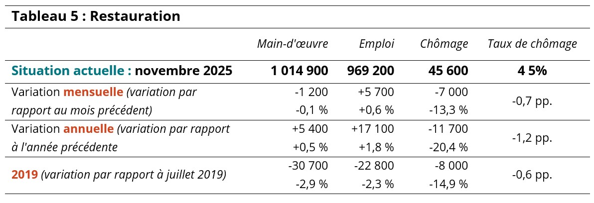 Le taux de chômage dans ce secteur est tombé à 4,5 % en novembre, grâce à 5 700 personnes supplémentaires ayant trouvé un emploi, tandis que 1 200 personnes ont quitté la main-d’œuvre (voir le tableau 5). L’emploi s’élevait à 969 200 personnes dans l’ensemble du pays, soit une hausse d’environ 17 000 travailleurs par rapport à l’année précédente. Le secteur associé est resté environ 23 000 travailleurs en dessous de son niveau de 2019, dans le cadre d’une main-d’œuvre inférieure d’environ 31 000 personnes.