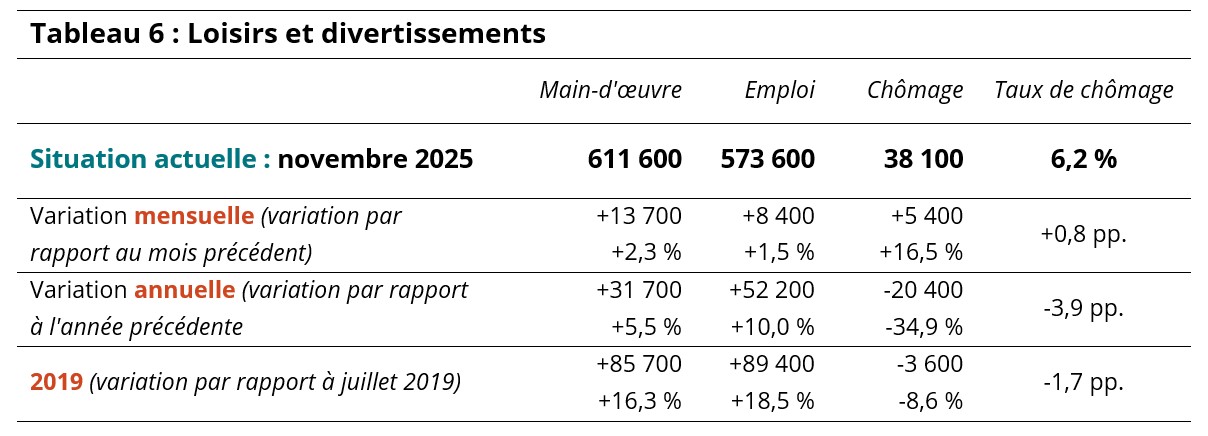 Le secteur des loisirs et divertissements a gagné environ 8 000 travailleurs en novembre, portant ses chiffres d’emploi à près de 574 000 et sa main-d’œuvre à environ 612 000 (tableau 6). Le chômage a augmenté de 5 400 personnes, portant le taux de chômage à 6,2 %. Le secteur était en bien meilleure posture cette année que l’année dernière, avec plus de 50 000 travailleurs supplémentaires ayant trouvé un emploi, et l’emploi y était près de 90 000 plus fort qu’en 2019.