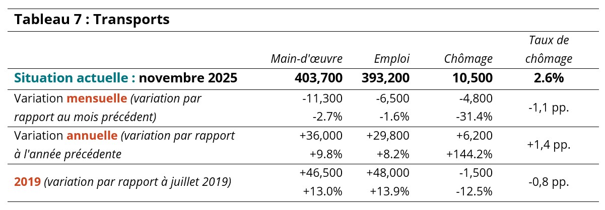 La main-d’œuvre (-11 000) et l’emploi (-6 500) ont tous deux diminué dans le secteur des transports par rapport à octobre, ce qui a eu pour effet de ramener le taux de chômage à 2,6 % en novembre (tableau 7). L’emploi s’élevait à 393 200 personnes, alors que la main-d’œuvre avait baissé à environ 404 000 personnes. La main-d’œuvre et l’emploi ont tous deux été plus élevés cette année que l’année dernière (environ +9 %), et également plus élevés qu’en 2019 (environ +13 %).