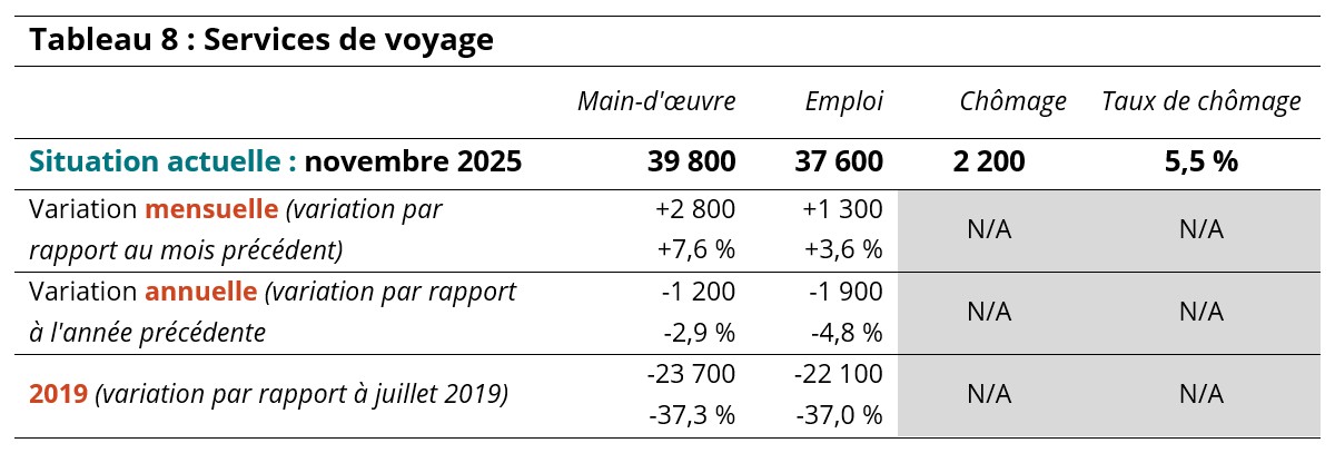 Les données du tableau 8 donnent une certaine analyse de la situation du secteur, mais il est préférable de les considérer comme des variations à long terme plutôt que comme une estimation réaliste du contexte actuel de l’emploi. Dans l’ensemble, les services de voyage sont restés nettement en dessous de leur niveau de 2019, et les variations par rapport au mois dernier et à l’année dernière ont été des fluctuations relativement faibles.