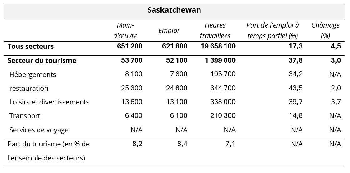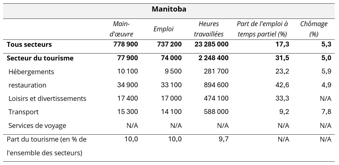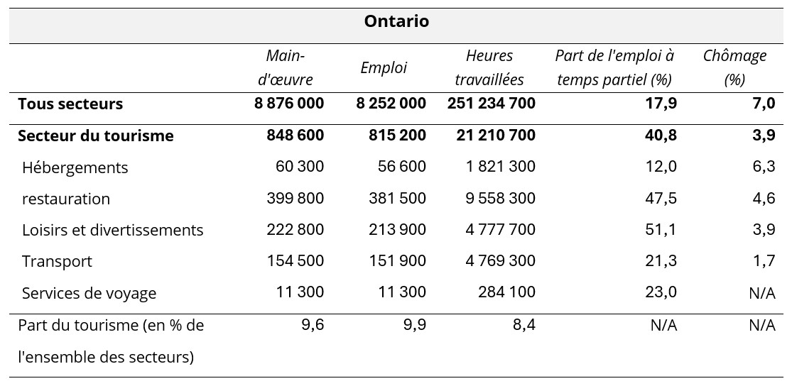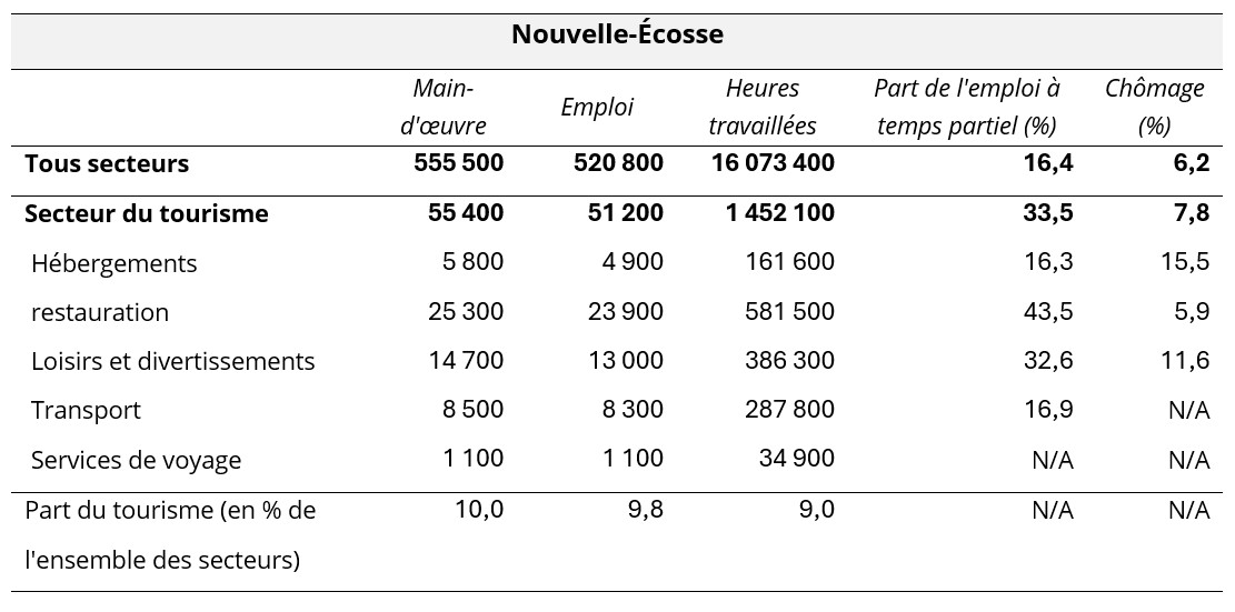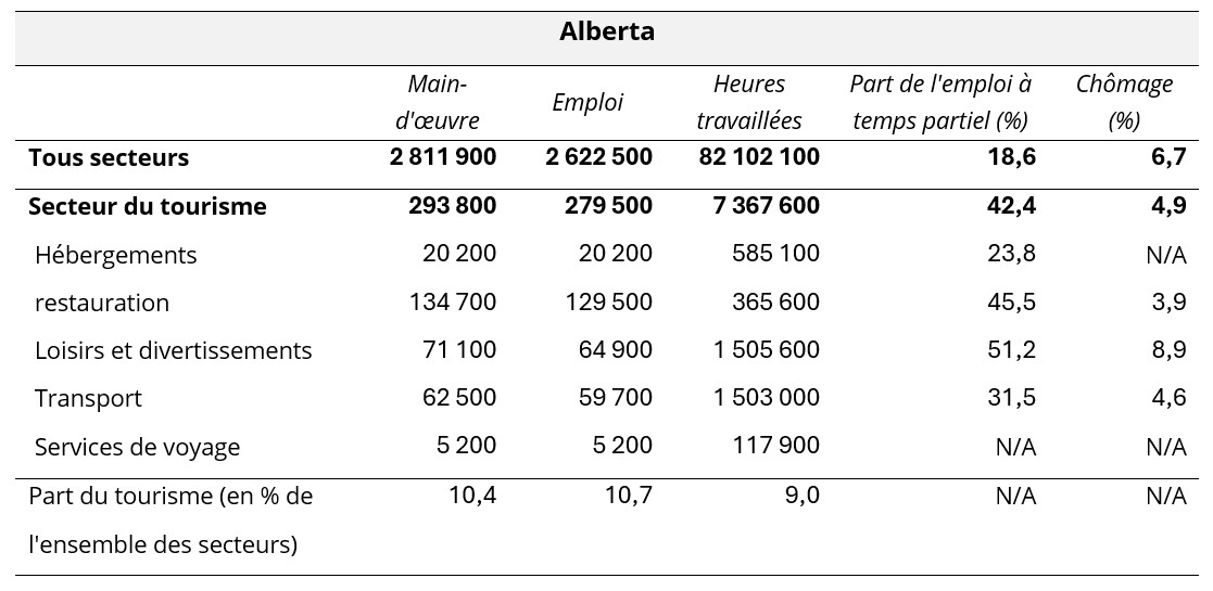 Les dix tableaux suivants présentent les sommaires des provinces pour septembre 2025, en mettant l’accent sur le tourisme et ses cinq secteurs associés. Des données comparatives sont fournies pour l’ensemble de l’économie provinciale à titre de critère de référence. Des données non désaisonnalisées sont fournies pour la main-d’œuvre, l’emploi et les heures travaillées, et la dernière ligne de chaque tableau indique la part du tourisme dans chacune de ces mesures. La part du travail à temps partiel (par opposition au travail à temps plein) est également fournie, en tant qu’indicateur approximatif de la composition de la main-d’œuvre, ainsi que les taux de chômage.