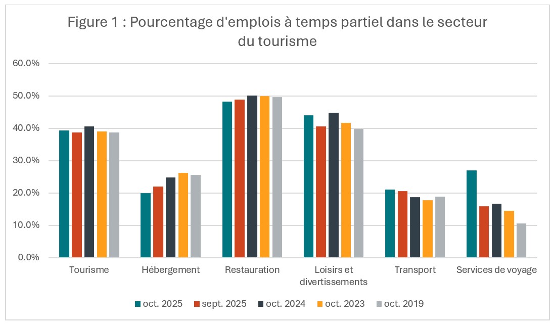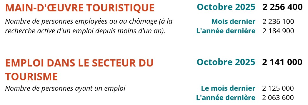 Le secteur du tourisme[1] en octobre 2025 a connu peu de changements par rapport au mois précédent en termes de main-d’œuvre ou d’emploi[2]. Les deux indices ont augmenté de moins d’un pour cent, ce qui correspond aux changements observés dans l’ensemble de l’économie.