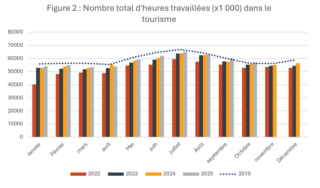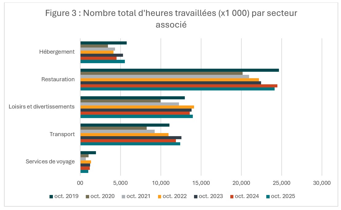 Le nombre d’heures travaillées offre une autre perspective utile sur la stabilité de la main-d’œuvre, dans la mesure où cette mesure est plus sensible aux changements à court terme de la demande touristique que les chiffres de l’emploi pris de façon isolée. Le nombre total d’heures travaillées dans le tourisme en octobre a diminué d’environ 4,5 % par rapport à septembre, ce qui est normal d’un point de vue saisonnier, mais les heures travaillées en octobre 2025 étaient supérieures d’environ 2,5 % à celles de l’année dernière, et de 1,2 % à celles de 2019. C’est la première fois que le nombre d’heures travaillées prépandémiques est dépassé.