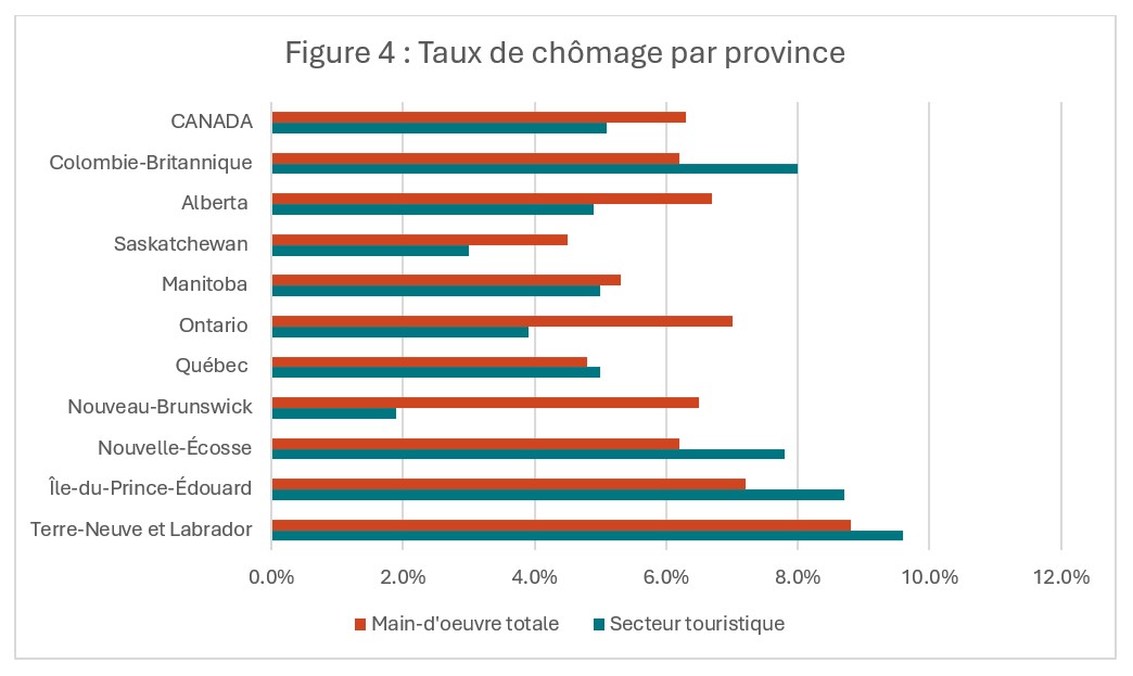 L’économie canadienne est sujette à des différences régionales prononcées, et cela est particulièrement vrai dans le secteur du tourisme. La figure 4 présente une comparaison des taux de chômage provinciaux, pour le secteur du tourisme en particulier et pour la main-d’œuvre touristique totale (c’est-à-dire comprenant tous les secteurs associés).