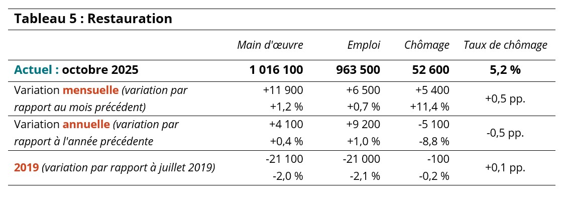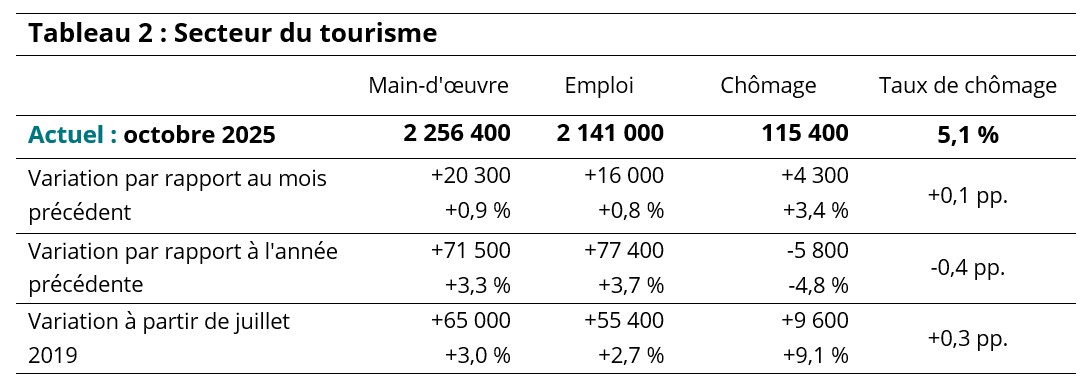 En octobre, le secteur du tourisme a vu l’intégration de 20 000 personnes dans la population active, portant le total à environ 2,26 millions, dont environ 2,14 millions en emploi (+16 000 par rapport à septembre) (voir tableau 2). Cette situation a entraîné une augmentation du taux de chômage, qui s’est établi à 5,1 %, affectant environ 115 000 personnes.