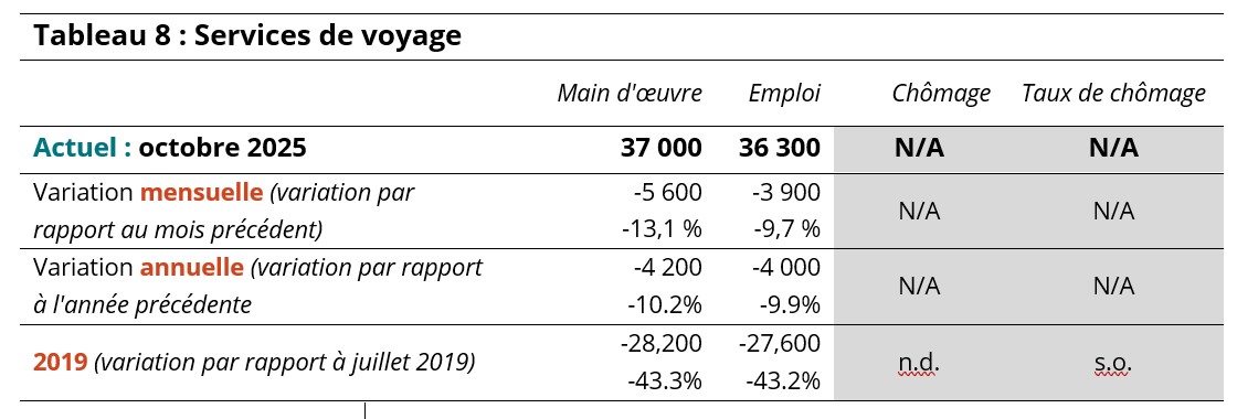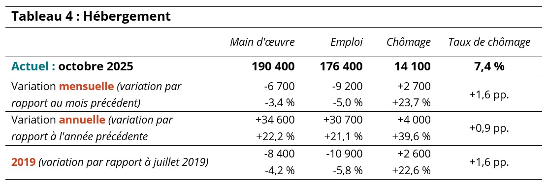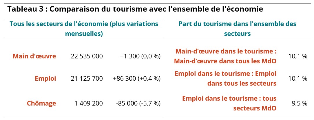 Tous secteurs confondus, le taux de chômage en octobre était de 6,3 % (calculé sur la base de données non désaisonnalisées), en baisse par rapport au taux de 6,6 % enregistré en septembre, mais toujours supérieur d’environ un point de pourcentage à celui du tourisme. L’économie dans son ensemble a vu environ 86 000 personnes entrer sur le marché du travail par rapport à septembre (tableau 3), ce qui a fait baisser les chiffres du chômage.