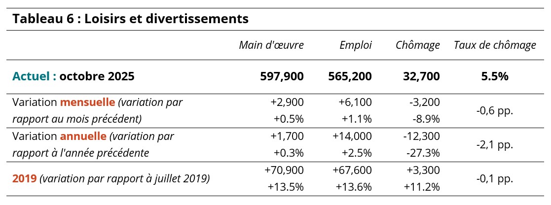 Le secteur des loisirs et du divertissement, qui a perdu environ 100 000 personnes en septembre, a enregistré de légères hausses en octobre (tableau 6). L’emploi a augmenté pour atteindre 565 000, tandis que le chômage a baissé d’environ 33 000, ramenant le taux de chômage à 5,5 %. L’industrie a connu une légère hausse de l’emploi par rapport à l’année dernière (+2,5 %) et une baisse sensible du chômage (avec un taux de chômage inférieur de 2,1 points de pourcentage à celui de 2024), ainsi qu’une hausse substantielle de l’emploi par rapport à 2019 (+13,6 %).
