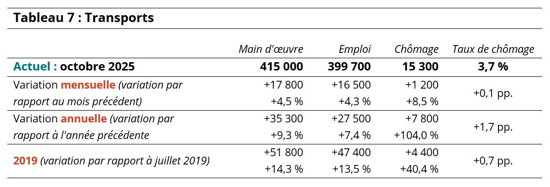 Le mois d’octobre a été marqué par une légère inversion des pertes de main-d’œuvre observées en septembre, ce qui a permis à l’emploi de remonter à 963 000 personnes (tableau 5). Le chômage a également augmenté de 5 400 personnes, portant le taux de chômage à 5,2 %. Par rapport à l’année dernière, la population active et l’emploi ont légèrement progressé, tandis que le secteur est resté inférieur d’environ 21 000 personnes aux niveaux de 2019. Le taux de chômage est resté relativement stable au cours de ces périodes.