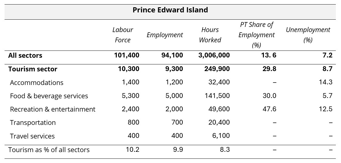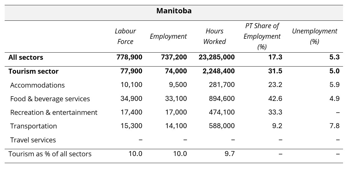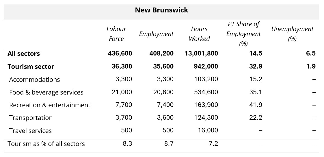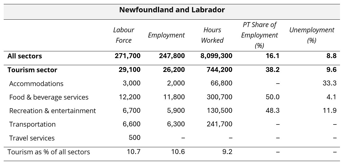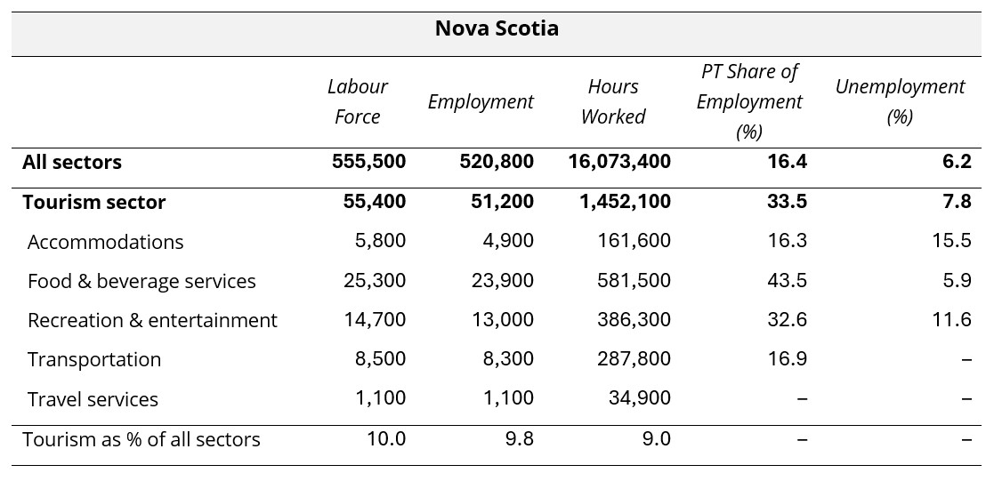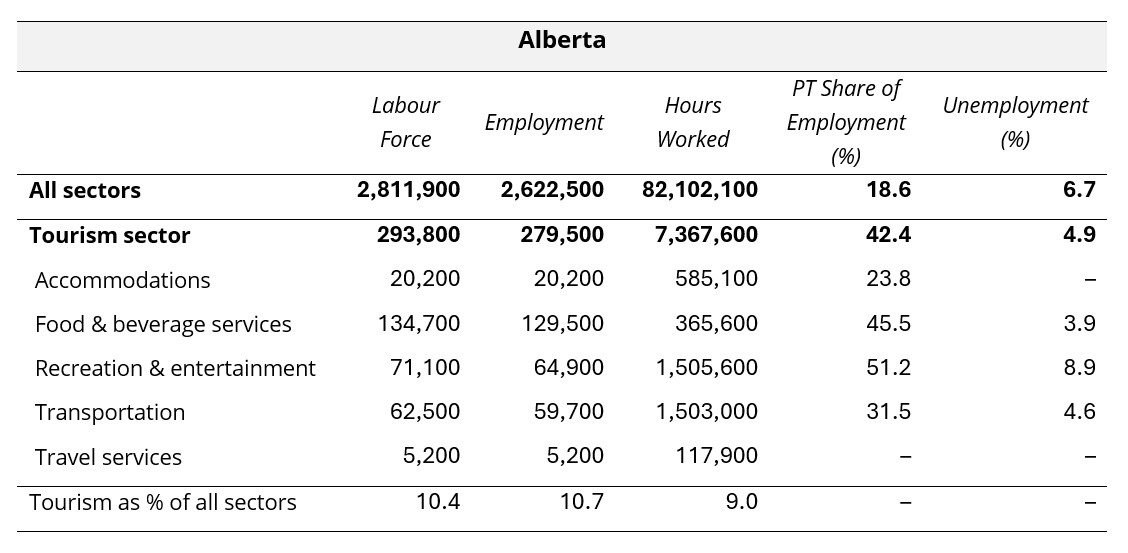 The following ten tables provide October 2025 summaries for the provinces, focusing on tourism and its five industry groups. Comparison data is provided for the larger provincial economy, as a benchmarking reference. Seasonally unadjusted estimates are provided for labour force, employment, and hours worked, and the final row of each table indicates tourism’s share of each of these metrics. The share of work that is part-time (as opposed to full-time) is also provided, as a rough indicator of the labour composition, as well as the unemployment rates.