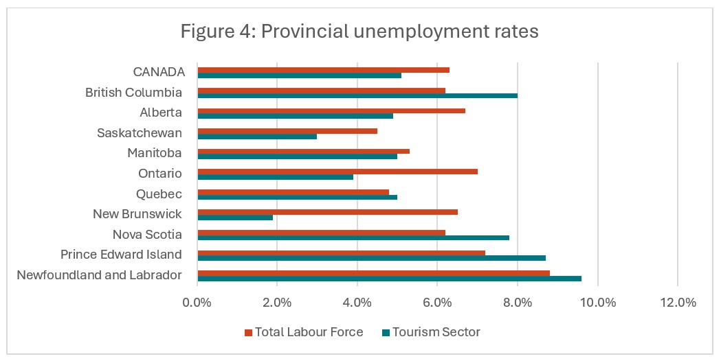 The Canadian economy is subject to some pronounced regional differences, and that is particularly true in the tourism sector. Figure 4 provides a comparison of provincial unemployment rates, for the tourism sector in particular and for the total labour force (i.e., comprising all industries).
