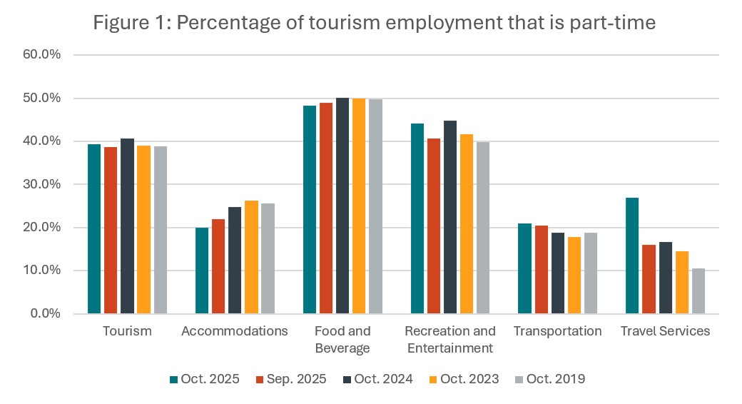 In October, tourism employment accounted for about 10% of all employment in Canada, which is little changed from last month; around 9.5% of the total Canadian labour force were working in tourism.
