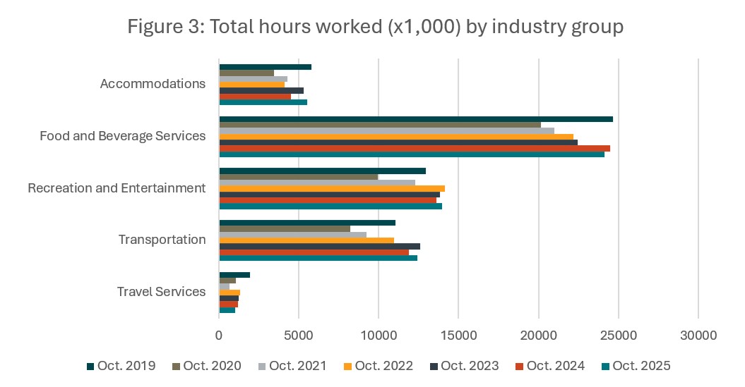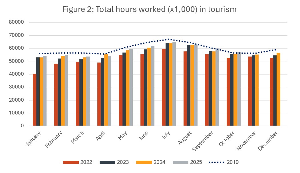 The number of hours worked provides another useful perspective on the stability of the workforce, in that this metric is more sensitive to short-term changes in tourism demand than employment figures in isolation. Total hours worked in tourism in October fell by around 4.5% from September, which is seasonally normal, but October 2025 hours worked were around 2.5% higher than last year, and 1.2% higher than they were in 2019. This marks the first time that pre-pandemic hours worked were surpassed.