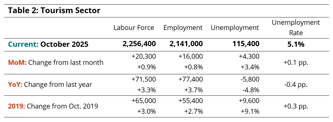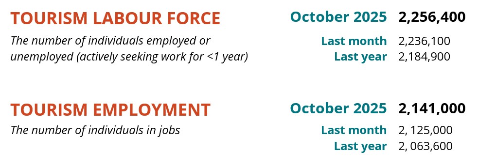 The tourism sector[1] in October 2025 saw little change over the previous month in terms of labour force or employment[2]. Both indices grew by less than one percent, on par with changes seen across the broader economy.