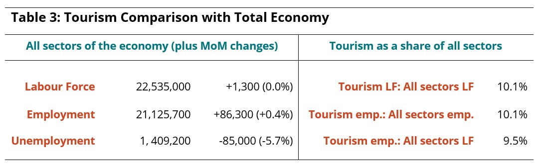 Across all sectors, the unemployment rate in October was 6.3% (calculated using seasonally unadjusted data), down from 6.6% in September but still around one percentage point higher than in tourism. The broader economy saw around 86,000 people enter employment from September (Table 3), which pulled the unemployment numbers down.