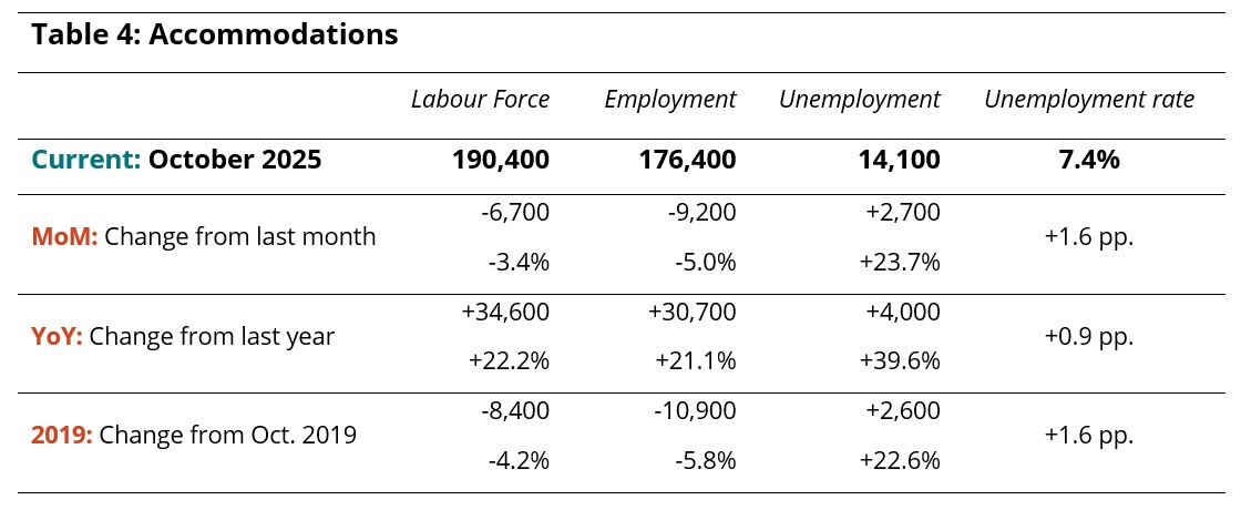 The accommodations industry saw gains across the summer, but began to lose workforce into autumn, a trend which continued in October (Table 4). Employment fell to 176,000 from September, while unemployment rose to 14,000, bringing the unemployment rate to 7.4%, which was also slightly higher than last year. Labour force and employment were stronger than last year, but both indices were lower than they were in 2019.