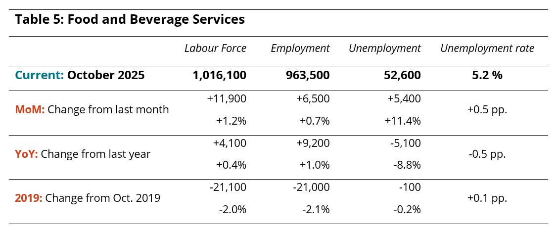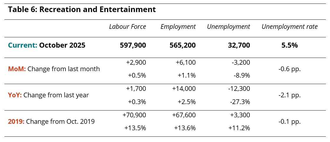 Recreation and entertainment, which lost around 100,000 people in September, saw slight gains in October (Table 6). Employment rose to 565,000, while unemployment fell to around 33,000, bringing the unemployment rate down to 5.5%. The industry saw slightly higher employment than last year (+2.5%) and appreciably lower unemployment (with an unemployment rate 2.1 percentage points lower than in 2024), and substantially higher employment than 2019 (+13.6%).