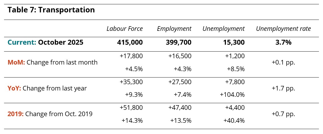 Along with recreation and entertainment, the transportation industry group saw growth relative to last month, last year, and 2019, across both labour force and employment (Table 7). Gains from September were around 4%, gains from last year were around 8%, and gains over the pre-pandemic baseline were around 14%. The unemployment rate has crept up somewhat, driven by larger gains in labour force than in employment, but remains lower than any other tourism industry.