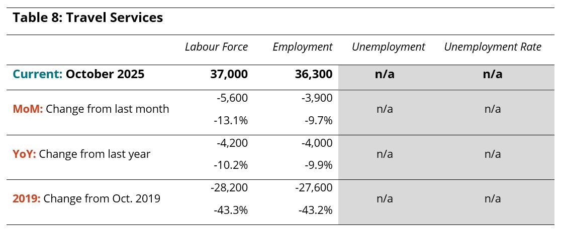 Data relating to the travel services industry group is not always reliable, due primarily to its small size relative to the LFS sample which can lead to substantial suppression in the raw data supplied by Statistics Canada. Because it is a small industry group, it is also prone to disproportionately large swings from month to month, particularly when things are considered as percentages. The data supplied in Table 8 provides some insights into the state of this industry, but should not generally be taken as a static snapshot of labour and employment, but rather as a broad indicator of trends. Overall, the industry remained substantially below 2019 levels in October, and continued to trend downward on a month-over-month basis.